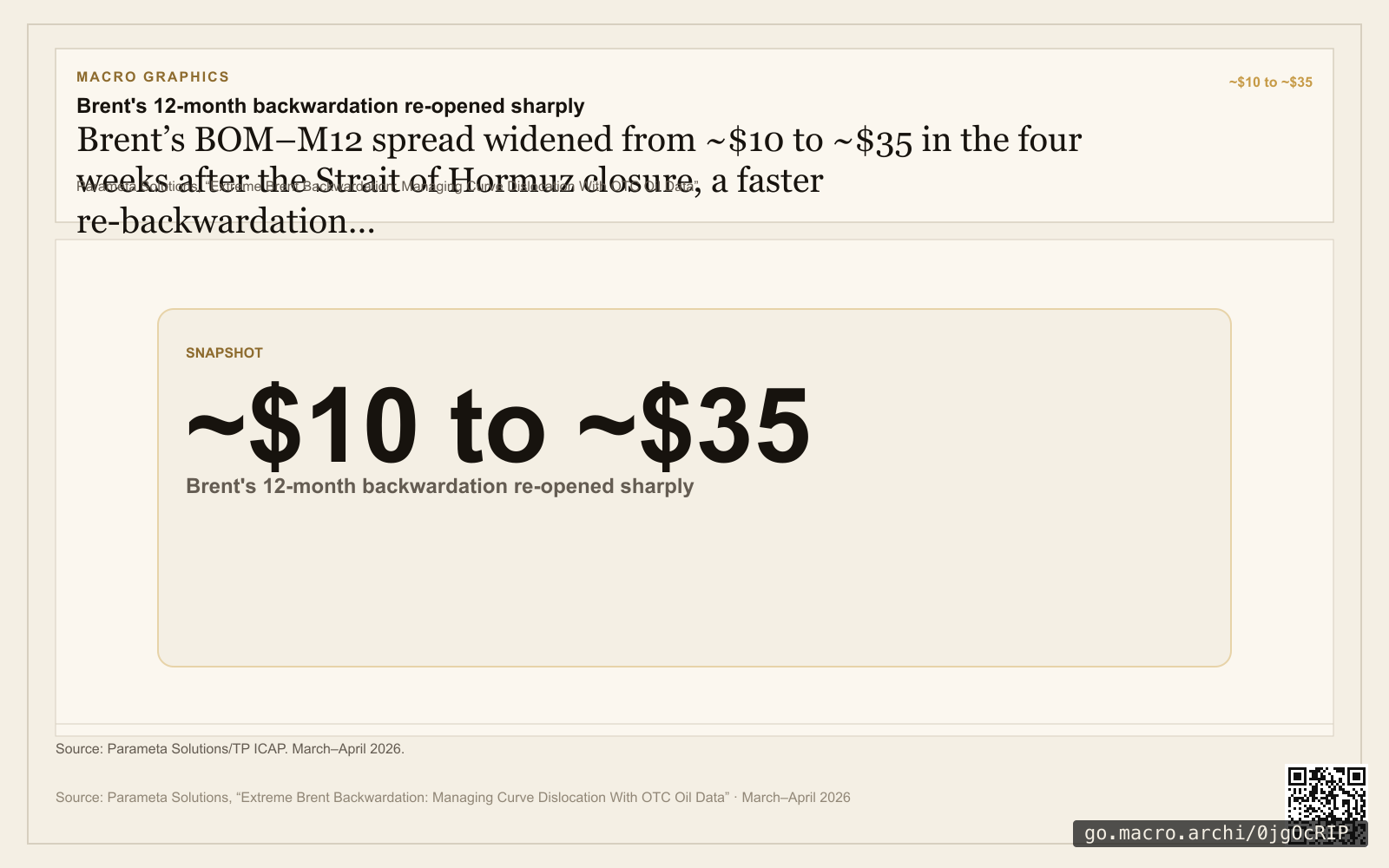 By April 10, Parameta's published note showed Brent's BOM-M12 spread at about $35, up from roughly $10 in early March. That is the chart's claim: the front end of the curve re-steepened fast.