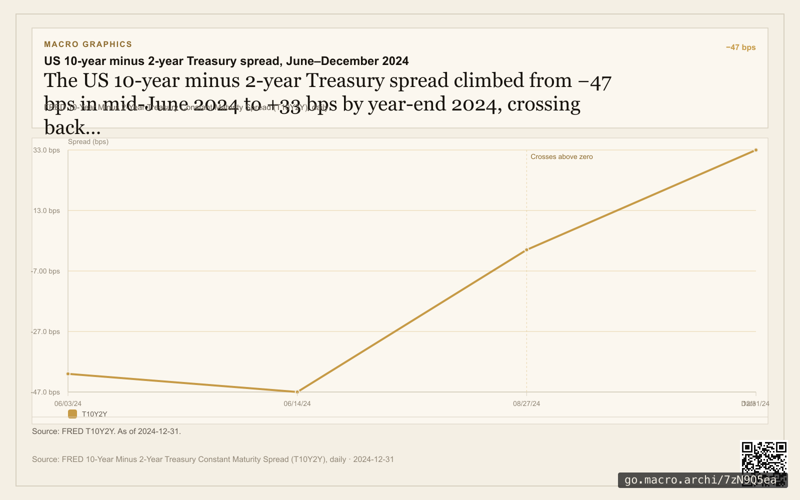 The spread moved from −47 bps on 2024-06-14 to 0.00 bps on 2024-08-27 and finished at +33 bps on 2024-12-31. Source: fred.stlouisfed.org